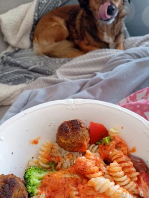 Mit Langmut& Konsequenz habe ich der das penetrante Betteln (Kopf auf Knie legen, stalkenstubsen,diesdas) , wo ehemalige Straßenhunde in Perfektion beherrschen, abgewöhnt. GLOTZEN wird jawohl noch erlaubt sein - ja natürlich . Von mir aus kann die ehrlich gesagt auch alles haben, ich hab seit Tod meines Vaters keinen Hunger mehr, dabei war ich immer sogenannte unkomplizierte Eßerin, aber Hunger + Appetit ist einfach weg wie mein Vater. Es inspiriert mich aber irgendwie irgendwo , daß alle Hunde wo ich ❤️ ² einfach immer Hunger haben und selbst von Erzfeind=Tierarzt Leckerlie nehmen. Davor und danach Knurren undoder Mißmut, aber kleine Leckerlie geht immer. Erstmal (Fr)essen und dann mal schauen . Es muß irgendwie, jaichweiß
